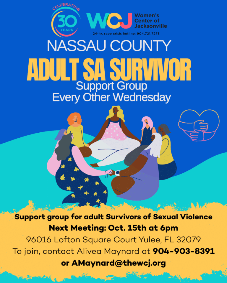 The Women’s Center of Jacksonville offers an in-person support group in Nassau County for adult survivors of sexual violence. Each session provides a confidential, compassionate environment to share experiences, build coping skills, and foster resilience through community.