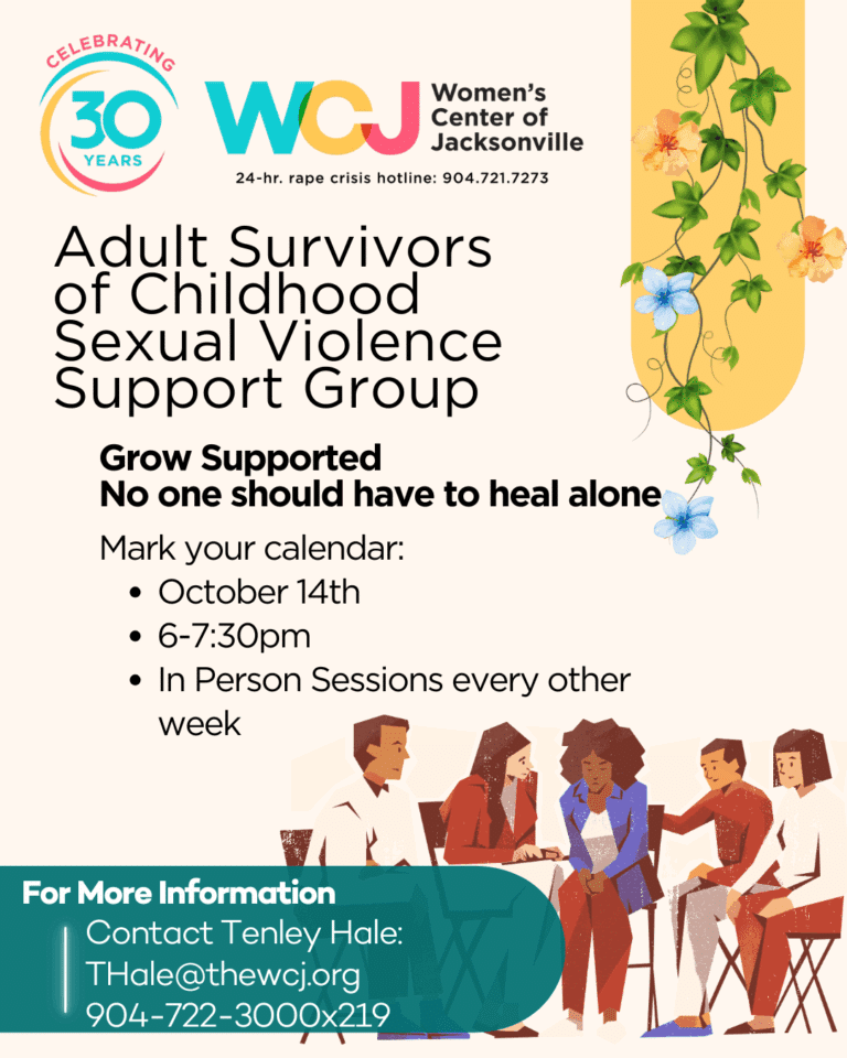 The Women’s Center of Jacksonville offers a biweekly in-person support group for adult survivors seeking a safe, compassionate space to process experiences, build resilience, and reconnect with hope.